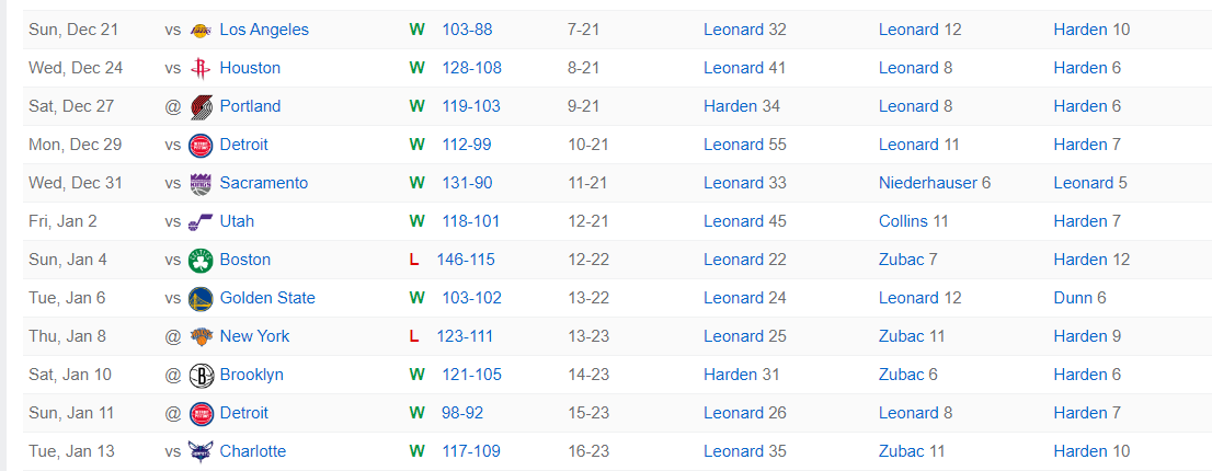 全场比赛小卡仅仅打31分钟,19中11,三分9中5,拿到35分5篮板3助攻1失误,命中率57.9%,三分命中率55.5%,真实命中率76.2%,正负值+8。过去的12场比赛小卡正负值+96快船第一。