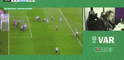 VAR长时间介入,裁判观看回放后认定哈兰德越位在先,进球无效。